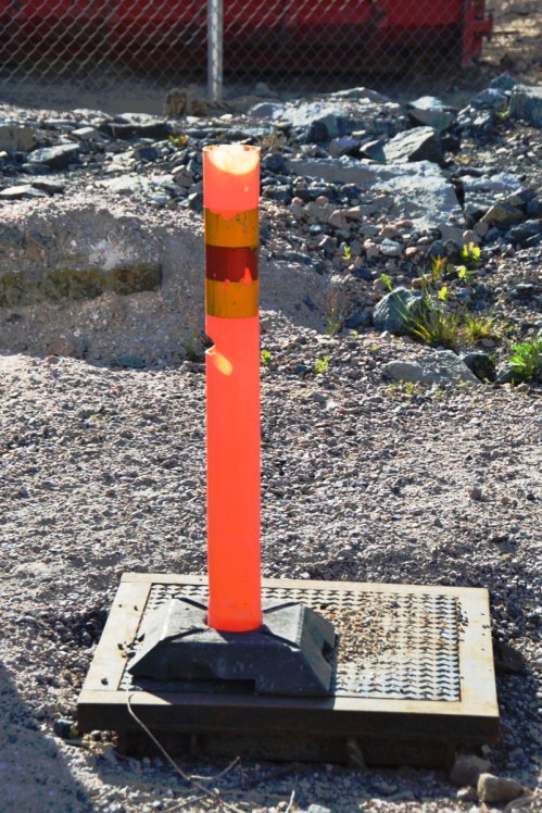 With a traffic cone coloured