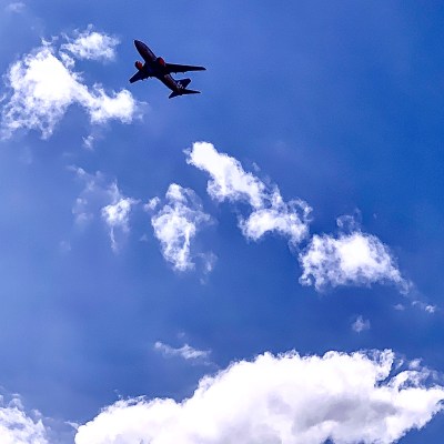 An aeroplane, in mid air, in flight